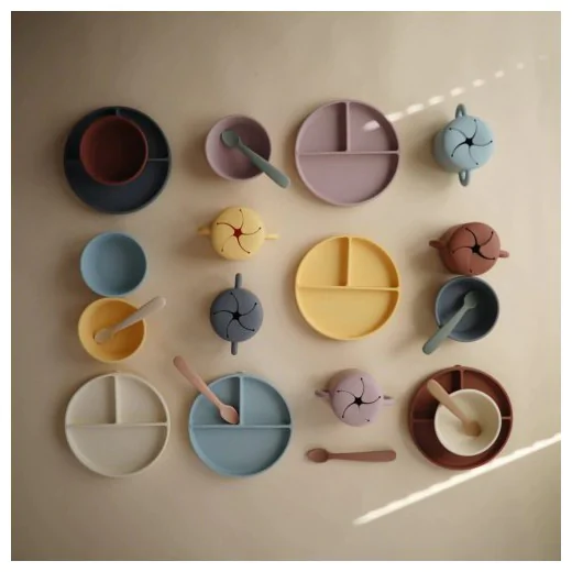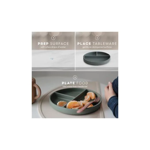 Przepiękny okrągły, trójdzielny talerzyk z kolekcji Mushie, który idealnie pasuje do silikonowych miseczek, sztućcy. Piękny design i doskonała jakość. Na dnie talerzyk posiada silikonową przyssawkę zapobiegającą jego przemieszczaniu się. Perfekcyjnie przywiera do płaskich powierzchni dzięki czemu jedzenie pozostaje na miejscu podczas nauki jedzenia.