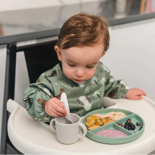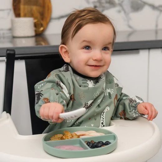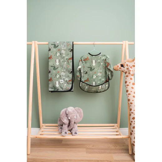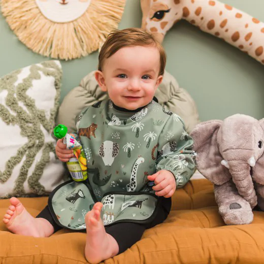 Praktyczny wodoodporny śliniak z rękawami oraz kieszonką, która wychwytuje spadające jedzenie oraz płyny. Śliniak chroniąc ubranka dziecka z przodu i zakrywając kolana, pozwala zachować je suche, oraz czyste podczas rozszerzania diety. Unikatowy krój, oraz zapinanie na napy gwarantuje szybkie założenie oraz ściągnięcie fartuszka.