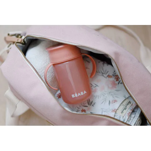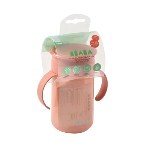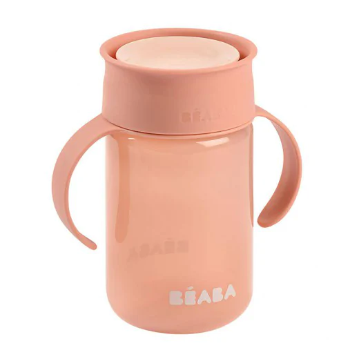 Poręczny i lekki kubeczek treningowy 360° francuskiej marki BEABA to praktyczne naczynie do nauki samodzielnego picia. System 360° umożliwia picie z dowolnej strony (jak ze szklanki), a prosty mechanizm docisku ust sprawia, że płyn wypływa tylko wtedy, gdy dziecko przyciska ustami dysk znajdujący się na środku, co zapobiega również rozlewaniu. Kubeczek ma pojemność 340 ml. Posiada zdejmowany ergonomiczny uchwyt – dwie zaokrąglone boczne rączki, wygodne do trzymania dla małych dzieci oraz dodatkową pokrywkę ułatwiającą utrzymanie higieny.