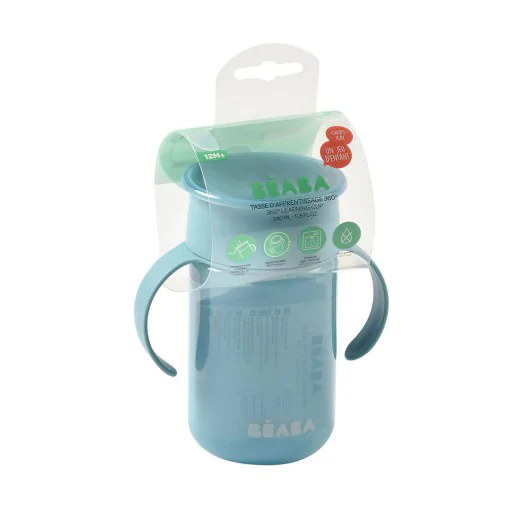Poręczny i lekki kubeczek treningowy 360° francuskiej marki BEABA to praktyczne naczynie do nauki samodzielnego picia. System 360° umożliwia picie z dowolnej strony (jak ze szklanki), a prosty mechanizm docisku ust sprawia, że płyn wypływa tylko wtedy, gdy dziecko przyciska ustami dysk znajdujący się na środku, co zapobiega również rozlewaniu. Kubeczek ma pojemność 340 ml. Posiada zdejmowany ergonomiczny uchwyt – dwie zaokrąglone boczne rączki, wygodne do trzymania dla małych dzieci oraz dodatkową pokrywkę ułatwiającą utrzymanie higieny.