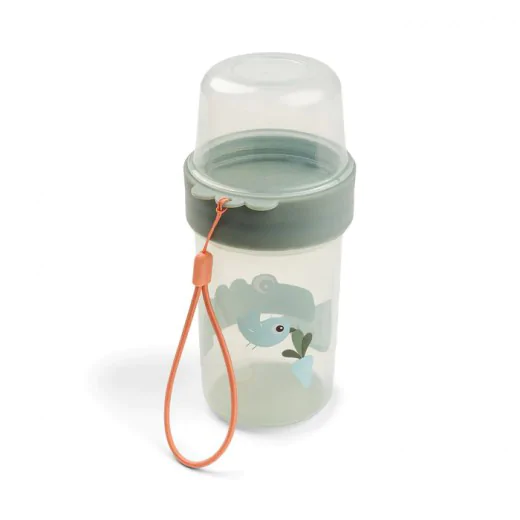 Użyj dolnej połowy hermetycznego pojemnika do przechowania jogurtu, cząstek owoców lub warzyw, a górnej – na granolę, dip lub orzechy. Pojemnik wyposażony jest w praktyczny pasek do przenoszenia, wygodny dla małych rączek. Można go podgrzewać w kuchence mikrofalowej i myć w zmywarce.