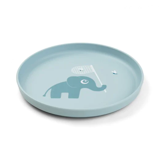 Na niebieskim talerzu nadrukowany jest uroczy motyw wesołego słonia Elphee łapiącego świetliki za pomocą sieci. Pozwól dziecku przyłączyć się do zabawy i szukać nowych wrażeń podczas posiłku. Ciemniejszy niebieski kolor podstawy dodaje ładnego dwukolorowego detalu.