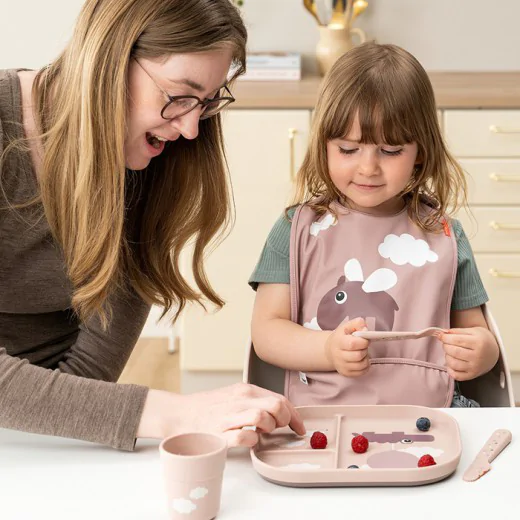 Pudrowy talerzyk dzielony ozdobiony jest motywem zabawy w chmurkach. Croco i Birdee eksplorują świat wśród chmur i zapraszają Twoje dziecko do poznawania nowych smaków i konsystencji. Ciemniejszy kolor pudrowy bazy talerzyka z podziałką dodaje dwukolorowego detalu.