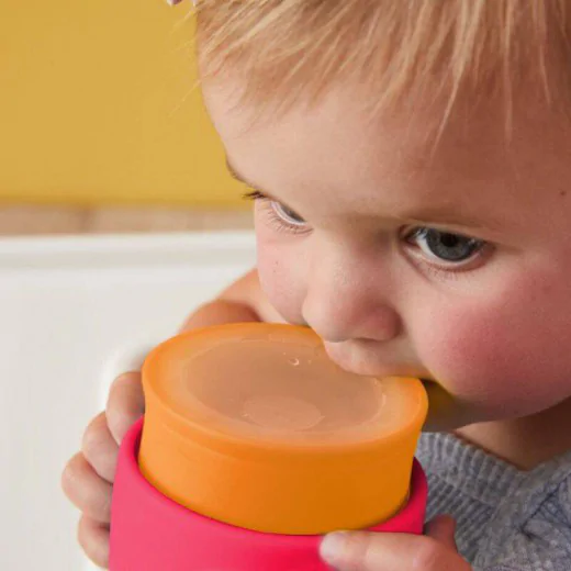 Obręcz pozwala dziecku wygodnie pić z każdej strony kubka – wystarczy przycisnąć ustami silikon, a napój zaczyna płynąć.