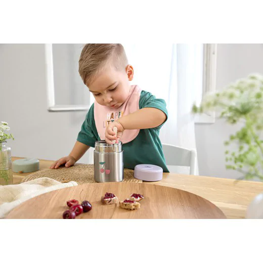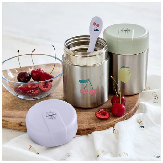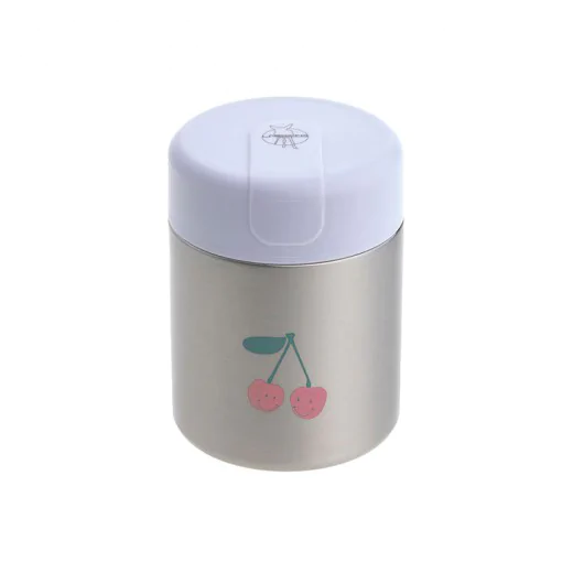 Pojemnik-termos obiadowy niemieckiej marki LASSIG przyda się nie tylko podczas podróży, ale także spacerów czy wycieczek. Ma pojemność 315 ml, jest lekki, poręczny i wytrzymały – dzięki podwójnym ściankom ze stali nierdzewnej długo zachowuje temperaturę posiłków, zarówno gorących, jak i zimnych. Szeroki otwór ułatwia napełnianie, podawanie jedzenia i czyszczenie. Hermetyczna jasnoniebieska pokrywka posiada dodatkową silikonową uszczelkę, zapewniającą szczelność naczynia. Pojemnik ma ergonomiczny kształt – zmieści się do plecaka, torebki czy bocznej kieszonki. Ma srebrny kolor z motywem uśmiechniętych wisienek. Stanowi część większej kolekcji Happy Fruits. Możesz dobrać do niego inny produkt w tej samej gamie kolorystycznej lub z tym samym motywem.