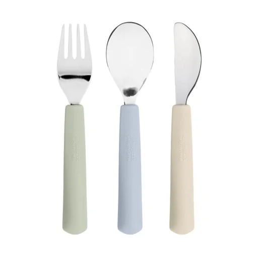 Komplet sztućców ze stali nierdzewnej niemieckiej marki LASSIG, składający się z widelca, łyżki i noża. Są lekkie i mają specjalnie profilowane kształty, co ułatwia dzieciom nabieranie pożywienia. Rękojeść z silikonu zaprojektowana została tak, by pasować do dziecięcej rączki. Jej ergonomiczny kształt z delikatnie spłaszczoną końcówką sprawia, że łatwo ją złapać i utrzymać, co wspiera rozwój samodzielności malucha. Sztućce mają kolorowe rączki: widelczyk – pastelowo zieloną z motywem uśmiechniętej cytrynki, łyżka – pastelowo niebieską z motywem gruszki, a nożyk – kremową z kolorowym napisem HAPPY. Zestaw stanowi część większej kolekcji Happy Fruits. Możesz dobrać do niego inny produkt w tej samej gamie kolorystycznej lub z tym samym motywem.