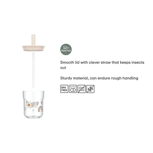 Szklanka o pojemności 250 ml została wykonana z odpornych materiałów, co gwarantuje jej trwałość nawet przy intensywnym użytkowaniu. Przeznaczona dla dzieci powyżej pierwszego roku życia. Jej lekką i poręczną konstrukcję docenią zarówno rodzice, jak i maluchy, a specjalnie zaprojektowana, gładka pokrywka z inteligentną rurką nie tylko ułatwia picie, ale również skutecznie chroni napój przed insektami podczas zabaw na świeżym powietrzu. Dodatkowym atutem jest fakt, że produkt jest wolny od BPA oraz można go myć w zmywarce, co zapewnia wygodę i bezpieczeństwo w codziennym użytkowaniu.