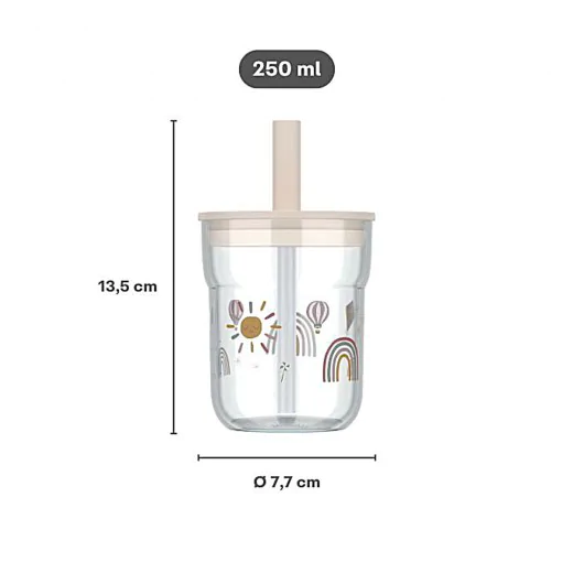 Szklanka o pojemności 250 ml została wykonana z odpornych materiałów, co gwarantuje jej trwałość nawet przy intensywnym użytkowaniu. Przeznaczona dla dzieci powyżej pierwszego roku życia. Jej lekką i poręczną konstrukcję docenią zarówno rodzice, jak i maluchy, a specjalnie zaprojektowana, gładka pokrywka z inteligentną rurką nie tylko ułatwia picie, ale również skutecznie chroni napój przed insektami podczas zabaw na świeżym powietrzu. Dodatkowym atutem jest fakt, że produkt jest wolny od BPA oraz można go myć w zmywarce, co zapewnia wygodę i bezpieczeństwo w codziennym użytkowaniu.