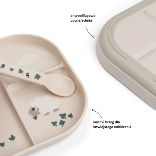 Talerzyk dzielony ozdobiony jest postacią krówki Dotti oraz owieczki Shepee, którzy zapraszają Twoje dziecko do poznawania nowych smaków i konsystencji. Ciemniejszy kolor bazy talerzyka z podziałką dodaje dwukolorowego detalu