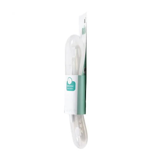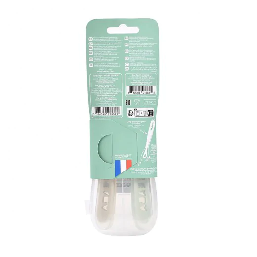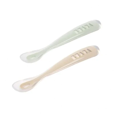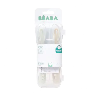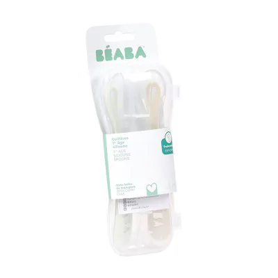 Zestaw dwóch ergonomicznych pierwszych łyżeczek dziecka francuskiej marki BEABA. Jedna w kolorze białym, druga w kolorze szarym, obie z transparentnymi brzegami. Miękkie końcówki łyżeczek wykonane zostały z ultraelastycznego silikonu, w pełni bezpiecznego dla delikatnych dziąseł maluszka. Ich kształt został zaprojektowany tak, by ułatwiał malcowi przejście ze smoczka na łyżkę. Długość uchwytu sprawia, że łyżeczki nadają się również do jedzenia pokarmów ze słoiczka. Uchwyt ten jest ponadto zaprojektowany do trzymania przez dorosłe ręce, podczas karmienia dziecka. Łyżki łatwo się czyści, można je myć ręcznie lub w zmywarce.