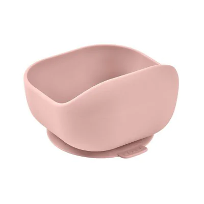 Silikonowa miseczka z przyssawką francuskiej marki BEABA posiada ergonomiczny, kwadratowy kształt z wysokimi, zaokrąglonymi po bokach brzegami, co wspiera dziecko w nauce samodzielnego jedzenia. Dodatkowo, jedna z krawędzi miseczki jest wyższa i delikatnie zakrzywiona do wewnątrz, co dodatkowo ułatwia dziecku samodzielne nabieranie posiłku na łyżkę. Naczynie ma na spodzie antypoślizgową przyssawkę, dzięki czemu jest stabilne i dobrze trzyma się stołu. Miseczka ma kolor jasnoróżowy.