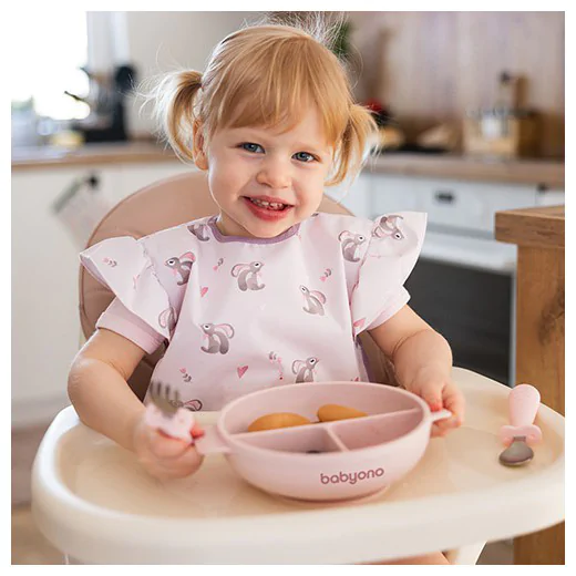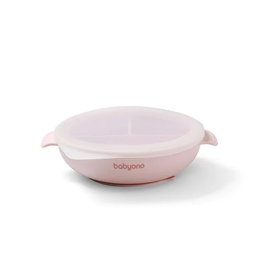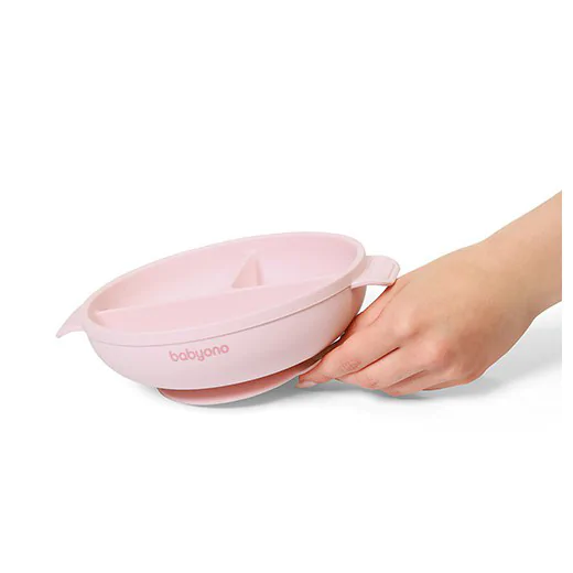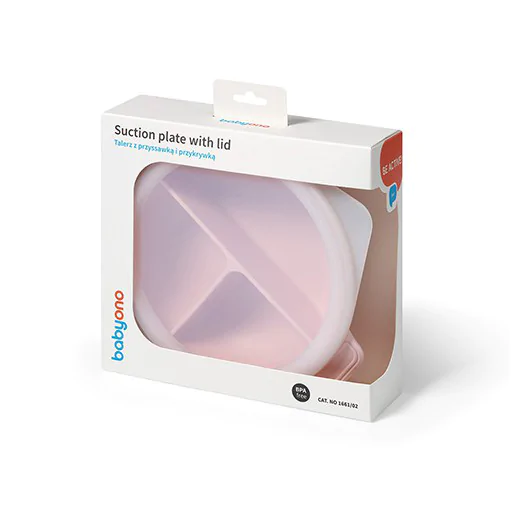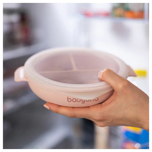 Trójdzielny talerz z przyssawką i przykrywką Babyono to Twój pomocnik przy rozszerzaniu diety maluszka, zwłaszcza metodą. Wprowadza nowe smaki, wspiera samodzielne jedzenie i ogranicza bałagan. Mocna przyssawka trzyma silikonowy talerz na swoim miejscu, a zaokrąglony kształt ułatwia nabieranie pokarmu. Trzy przegródki pozwalają rozdzielić składniki, by dziecko mogło próbować każdego smakołyku osobno. Pokrywka utrzymuje ciepło i świeżość posiłków, a antypoślizgowe uchwyty umożliwiają wygodne przenoszenie naczynia. Talerzyk z podziałką i pokrywkę wykonaliśmy z bezpiecznego i trwałego silikonu. Możesz bez obaw podgrzewać je w mikrofalówce i myć w zmywarce.