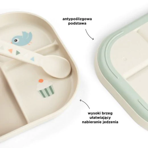 Wysokie krawędzie talerza ułatwią dziecku nabieranie jedzenia, a praktyczna antypoślizgowa podstawa gwarantuje, że talerz pozostanie na swoim miejscu. Talerz z przegródkami jest przeznaczony do codziennego użytku z dziećmi i można go myć w zmywarce oraz używać w kuchence mikrofalowej.