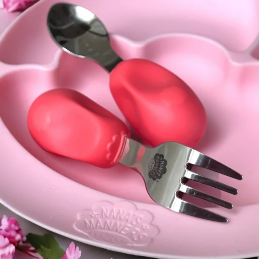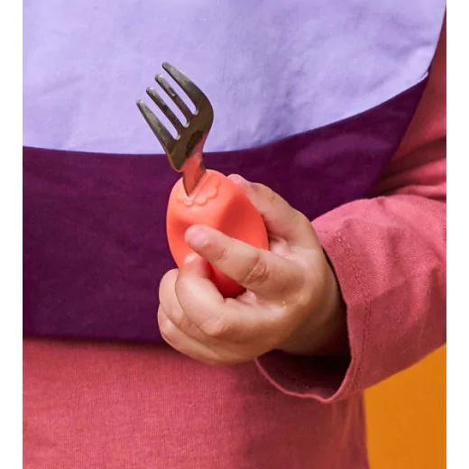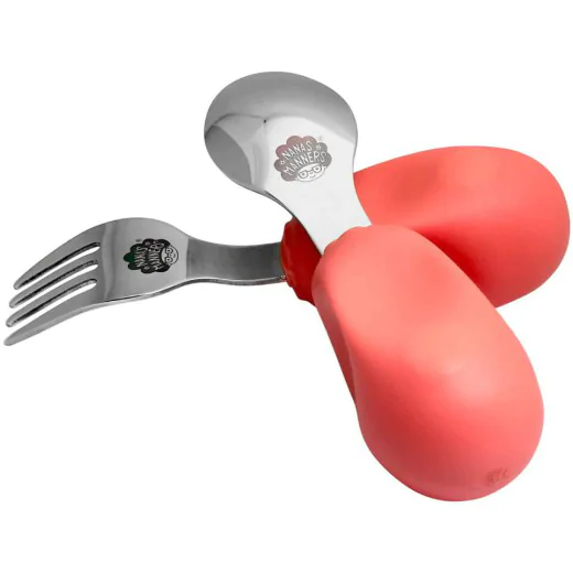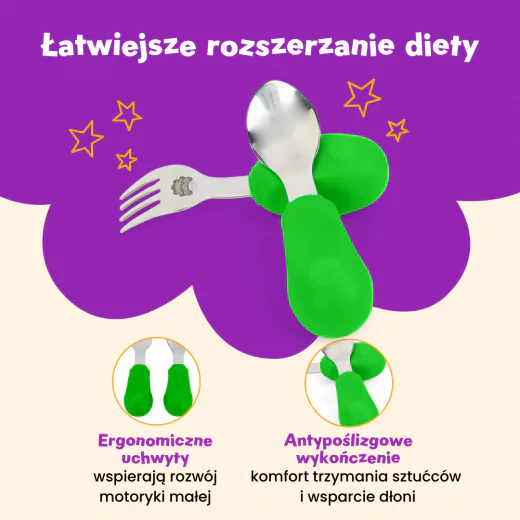 Przeznaczone dla dzieci, które rozwijają umiejętność posługiwania się prawą i lewą dłonią w koordynacji ręka-oko. Sztućce ćwiczące uścisk dłoniowy (Palmar Grip) oraz chwyt cęgowy, używając palców wskazujących i kciuka. Wspierają budowanie pewności siebie podczas samodzielnego spożywania posiłków. Zestaw polecany dla dzieci między 10-12 miesiącem życia do około 3 lat. Tak długo jak dziecko posługuje się chwytem dłoniowym. Absolutnie intuicyjne.