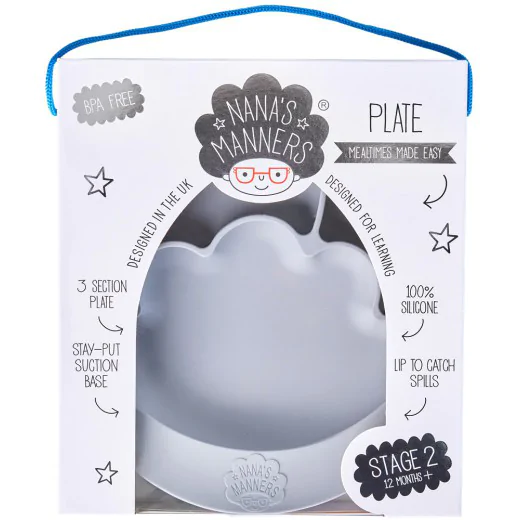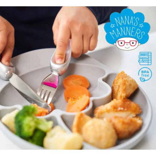 Talerz Nana's Manners został stworzony dla dzieci, które rozpoczynają ekscytującą przygodę samodzielnego jedzenia! Idealnie dopasowany do małych posiłków. Talerzyk Nanas posiada trzy sekcje, przegródki, dzięki którym dziecko samo decyduje co będzie mieszać czy maczać według swoich potrzeb. Wydłużony przód pomaga wrócić niesfornemu jedzeniu na talerzyk.